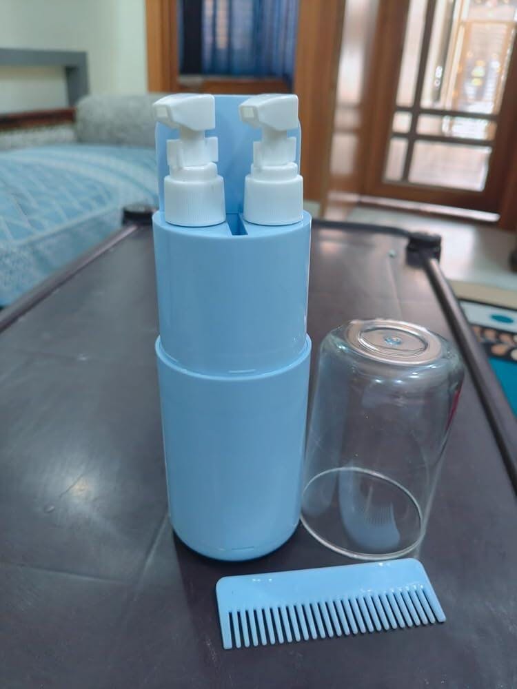 All your essentials in one compact kit โ includes 2 liquid dispensers, toothbrush & toothpaste space, mouthwash cup, towel compartment, mirror, and comb. Perfect for travel or daily use.